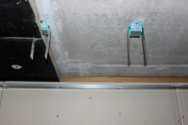 Первый этап каркасной системы звукоизоляции потолка в комнате жилого монолитного дома
