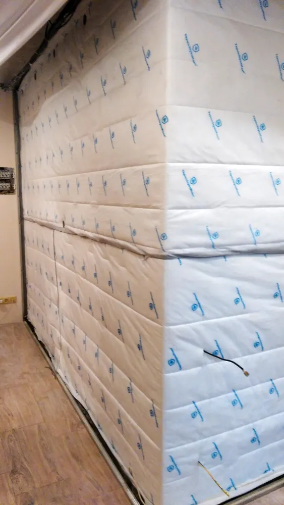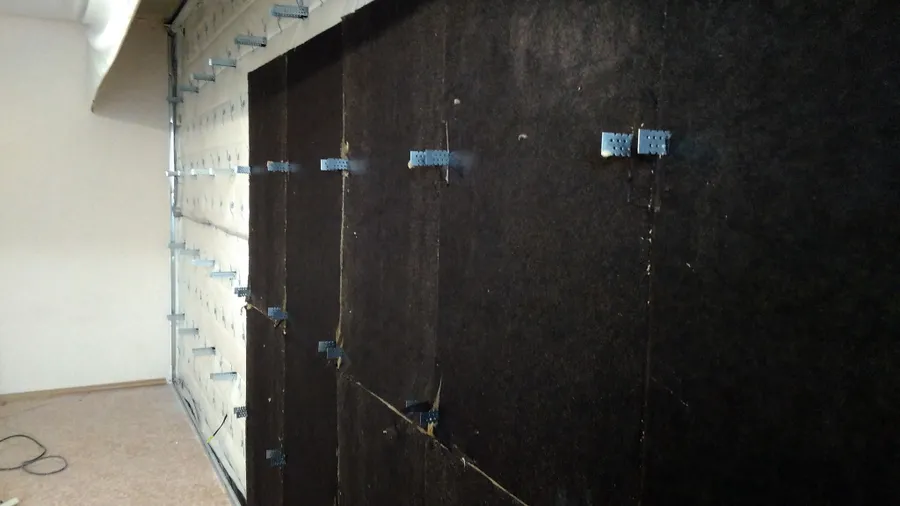 Заключительный этап звукоизоляционной системы: монтаж мембраны "Тексаунд 70" между двумя слоями ГКЛ