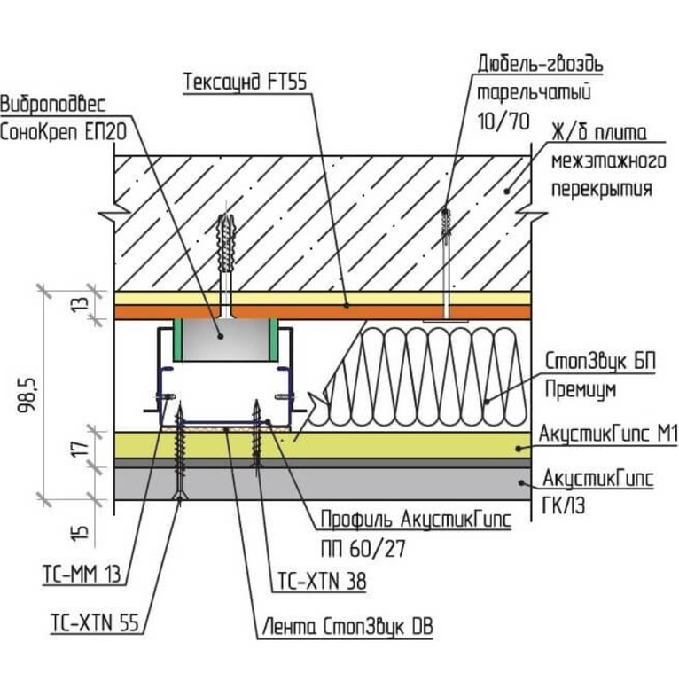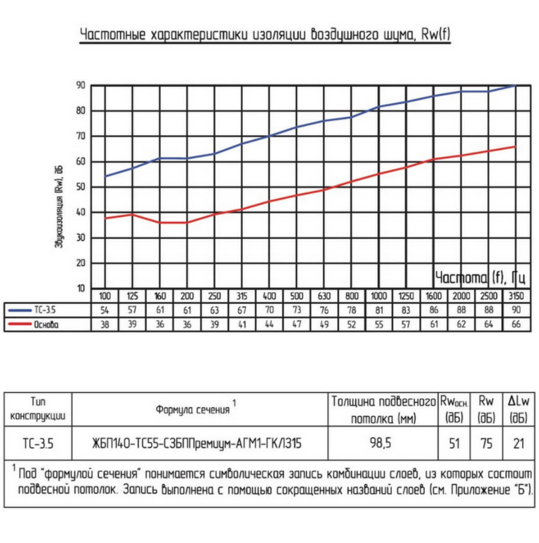 Степень звукоизоляции: Rw = 75 дБ Толщина, мм: 98,5 Масса системы: 46,3 кг/м²