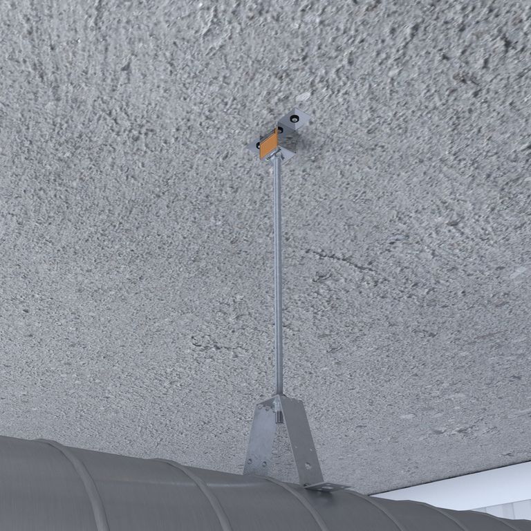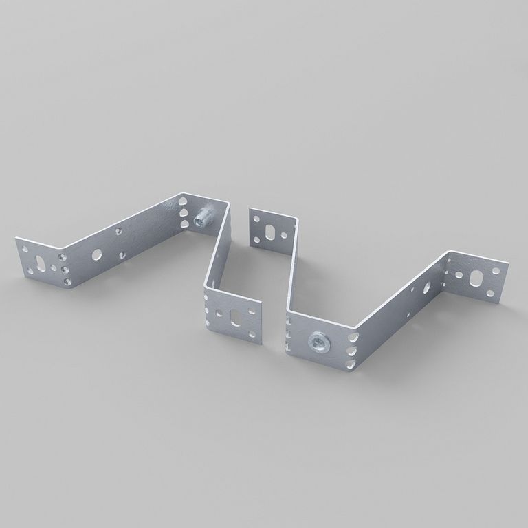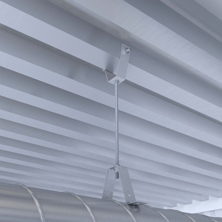 К воздуховоду изделие крепится саморезами с пресс-шайбой или заклепками в 2-х боковых отверстиях. Высота подвески воздуховода может регулироваться резьбовой шпилькой. Кронштейн может крепиться непосредственно к перекрытию из профилированного листа, к бетонному перекрытию. Размер монтажного отверстия – М8.