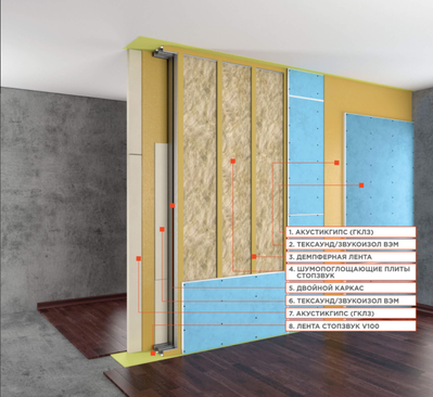 Система повышенной эффективности для разделения двух помещений друг от друга. Применяется в гостиницах, кабинетах, переговорных, производственных цехах и т.п. Обеспечивает помещение максимальной защитой от проникновения воздушного шума. Основным элементом системы является вязкоэластичная мембрана Тексаунд.