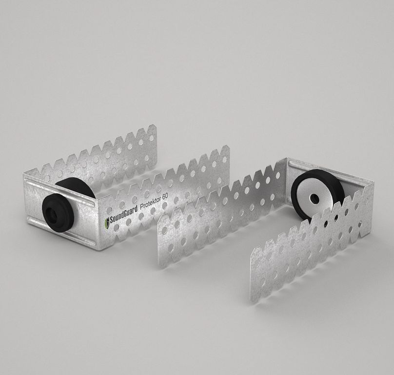 Представляет собой П-образный несущий профиль с упругим элементом из резины, который исключает контакт основания и крепежного элемента с несущим профилем. С его помощью обеспечивается снижение передачи структурного шума от перекрытия на каркас подвесного потолка или стены (на каркас возводимой конструкции).