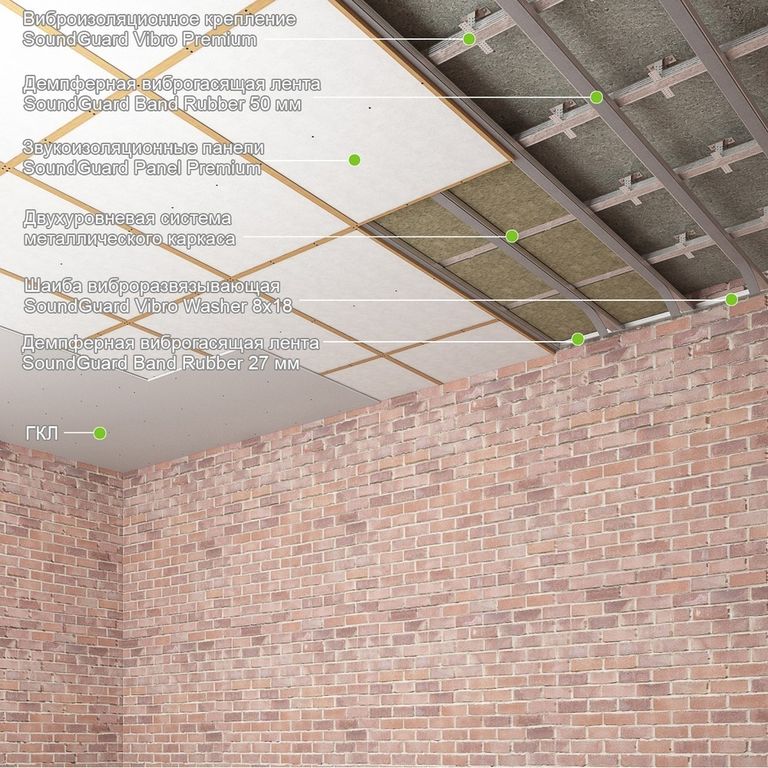 Готовый набор ВСЕХ необходимых материалов для звукоизоляции потолка. Толщина конструкции 80 мм, прибавляет к существующему потолку от 17 до 20 дБ.